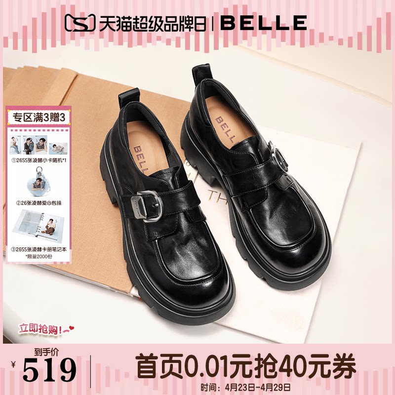 百丽黑巧乐福小皮鞋女2026新款复古英伦风黑色厚底增高单鞋子