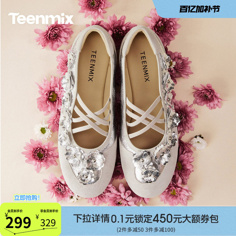 天美意复古软底芭蕾玛丽珍皮鞋平底鞋女银色浅口单鞋2026春季新款
