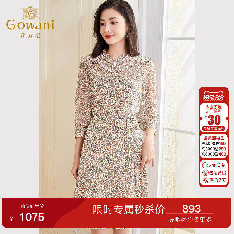 乔万尼春新款复古印花圆领桑蚕丝长袖连衣裙气质中长款EF3E903