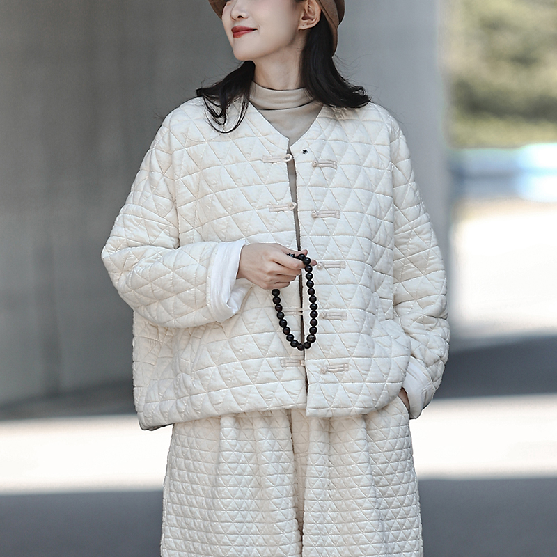 麻意 复古禅意菱格棉衣外套女短款 秋冬新款宽松加厚小个子棉服