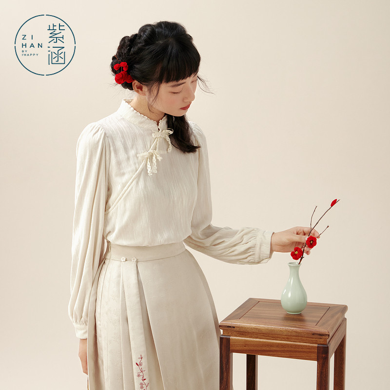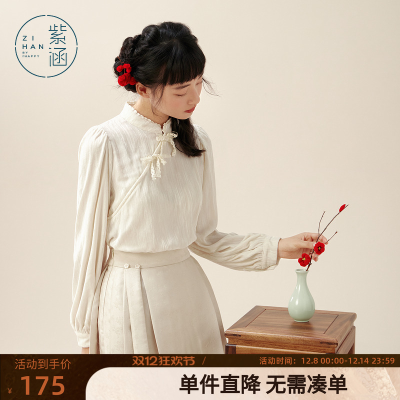 紫涵新中式立领斜襟盘扣衬衫女士冬季新款国风禅意灯笼袖内搭上衣