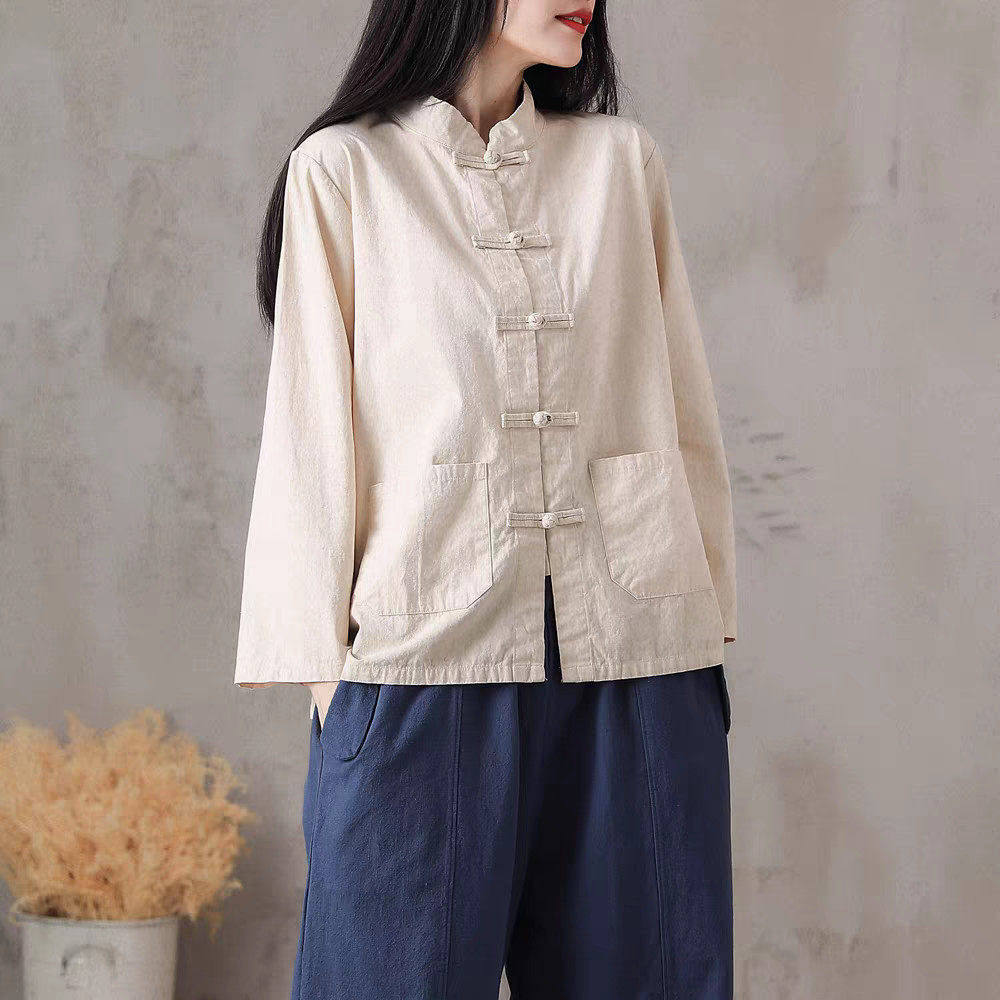 棉麻衬衫女春季民族风中式唐装复古盘扣汉服开衫纯色上衣禅衣茶服