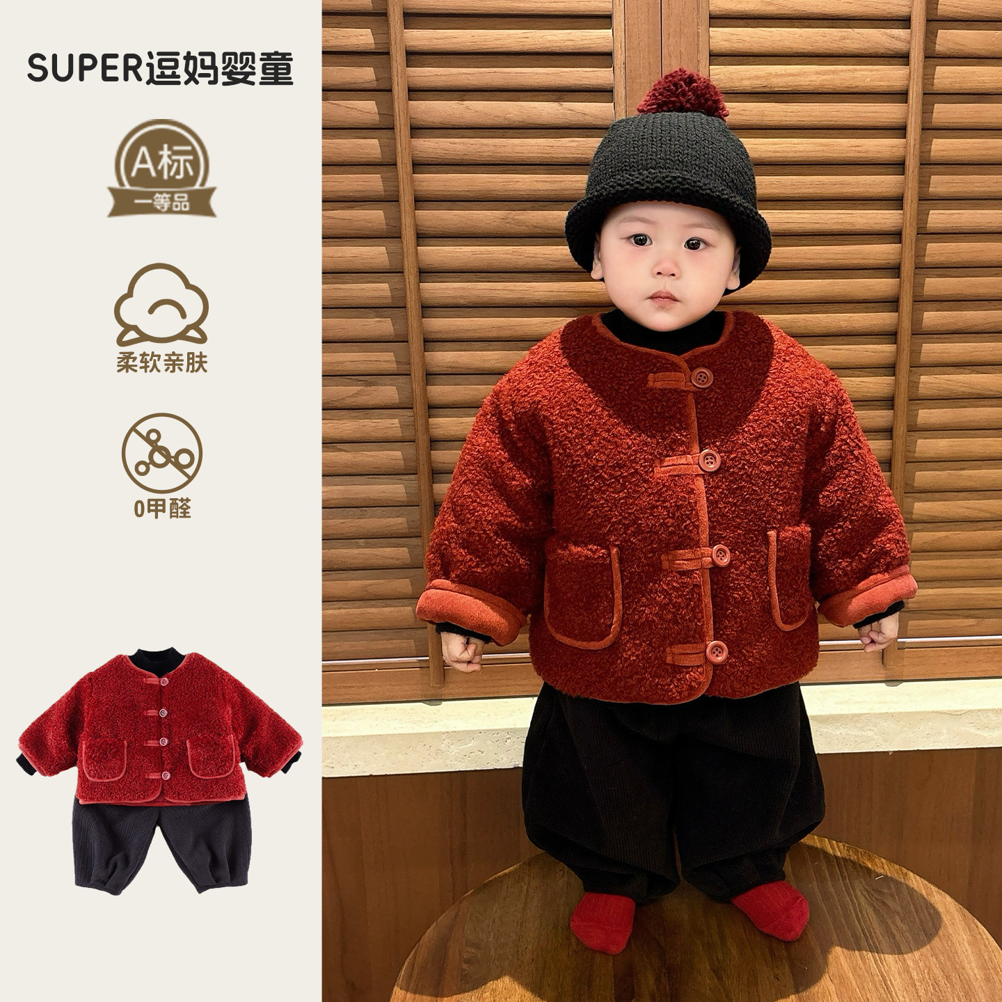 婴儿衣服分体套装冬喜庆洋气加厚拜年服冬款棉衣加绒裤毛衣三件套