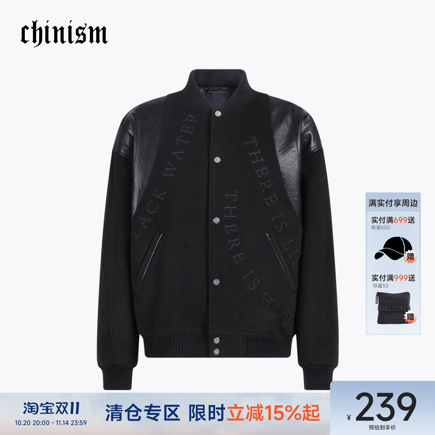 CH毛呢拼接棒球服夹克男秋季美式潮流宽松黑色男士休闲翻领外套