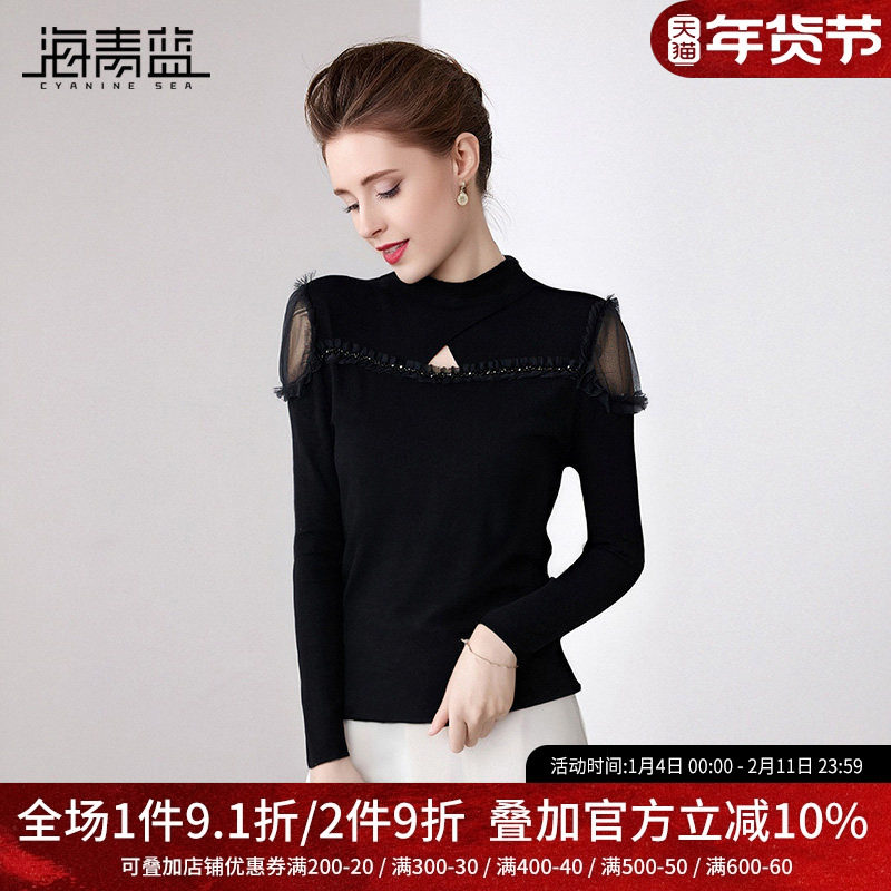 海青蓝 半高领针织衫25年新款秋冬内搭打底镂空女装时尚气质上衣