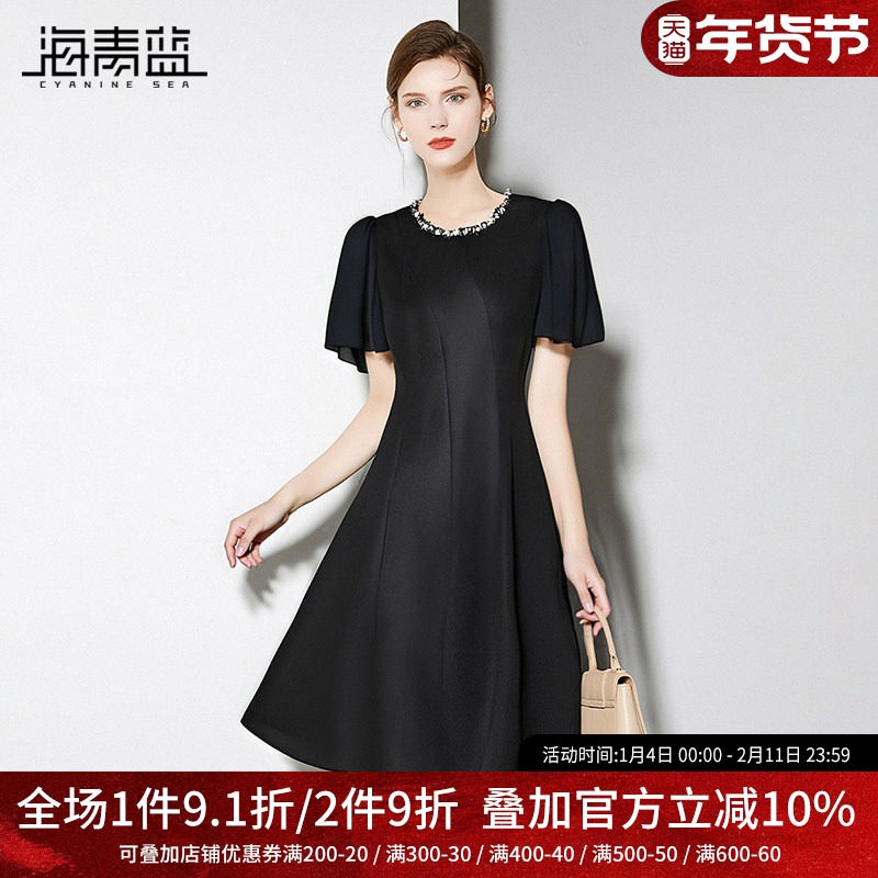 海青蓝 连衣裙夏女2025新款高级设计感纯色拼接中长款短袖女装裙
