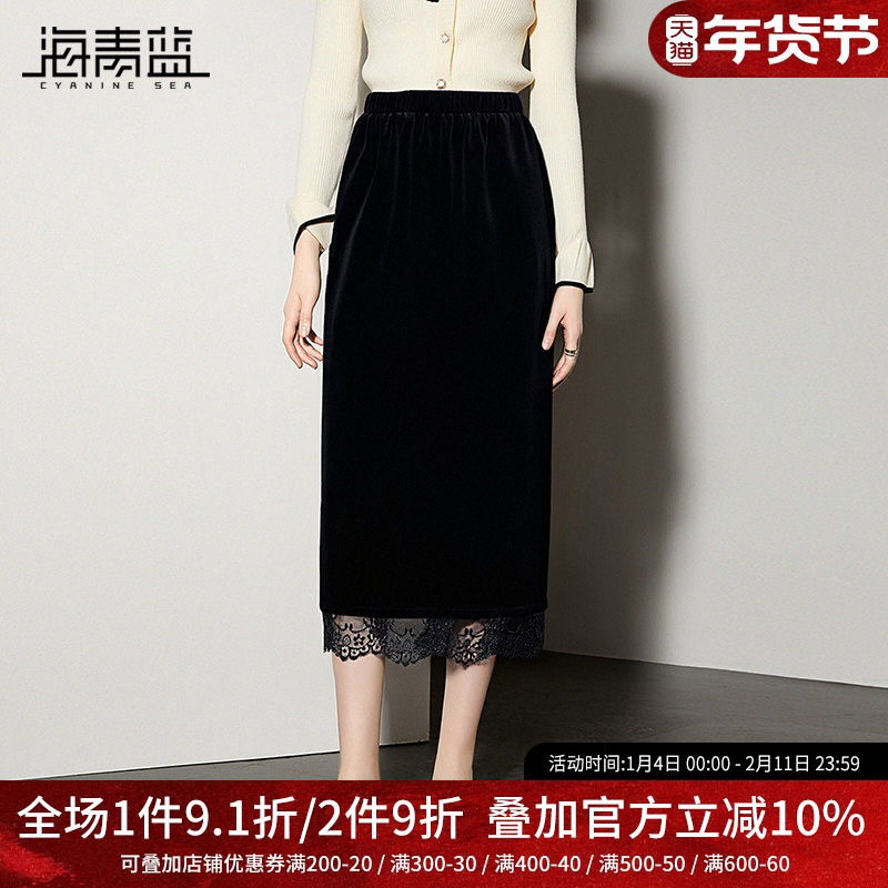 海青蓝 丝绒半身裙女2025新款冬高级女装时尚洋气蕾丝拼接裙子