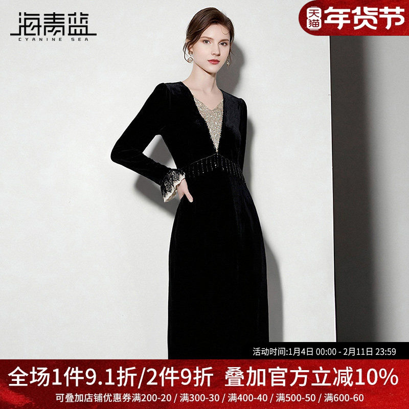海青蓝 秋冬丝绒连衣裙2025年新款长袖漂亮好看女装中长款裙子