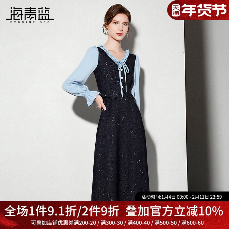 海青蓝 秋冬连衣裙女2025新款长袖高级度假亮片中长款女装裙子