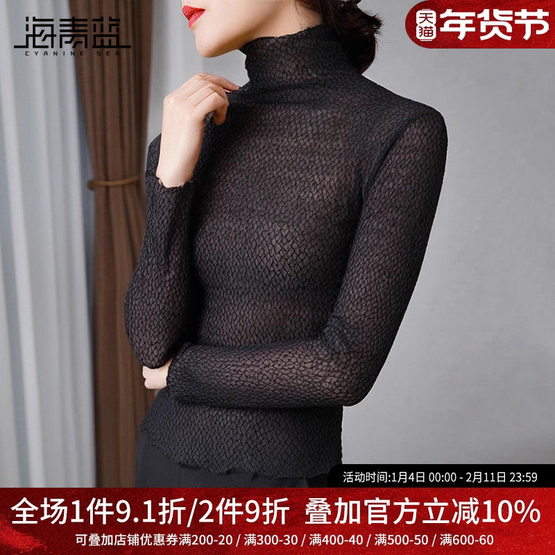 海青蓝女装木耳边高领网纱打底衫女修身2024秋季新款内搭长袖上衣