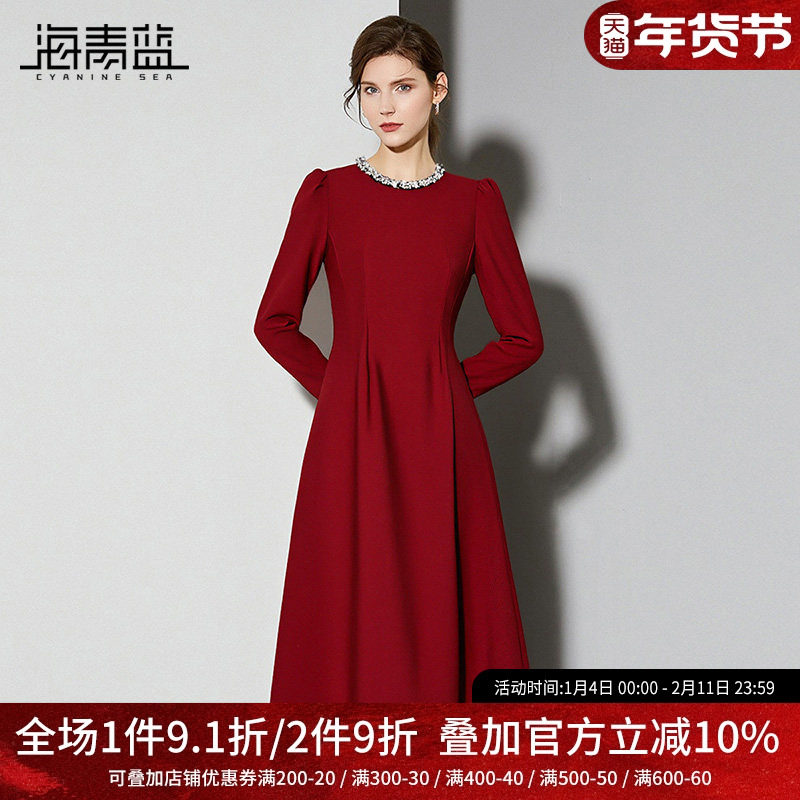 海青蓝 红色连衣裙女2025年新款长袖中长款洋气时尚气质女装裙子