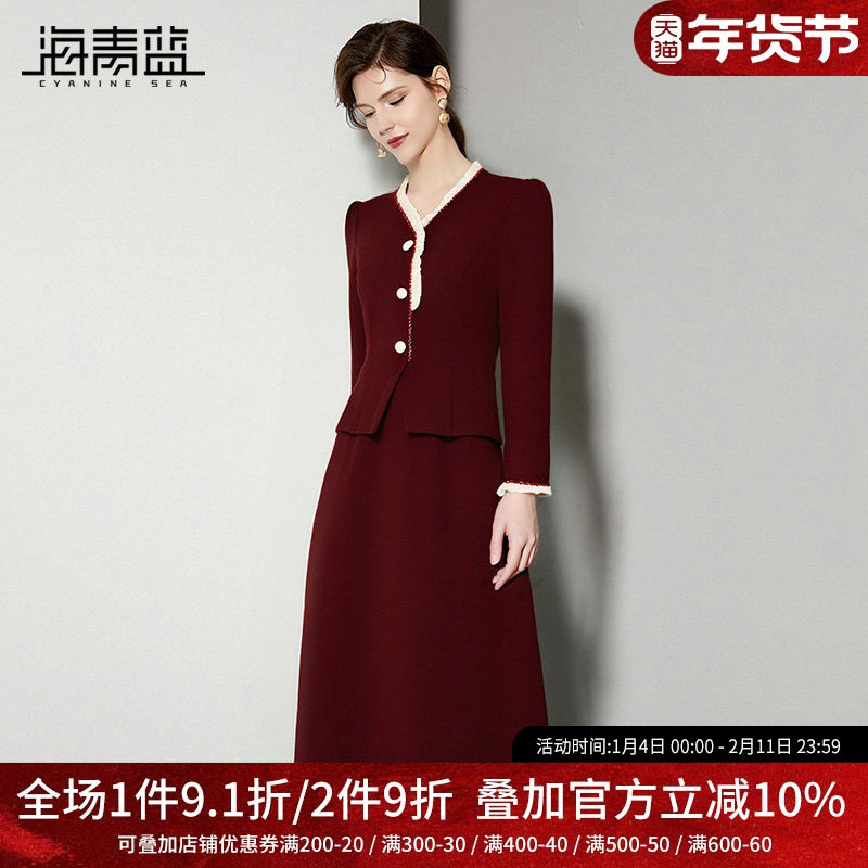 海青蓝 红色连衣裙女2025新款冬时尚气质女装高级设计感长袖裙子