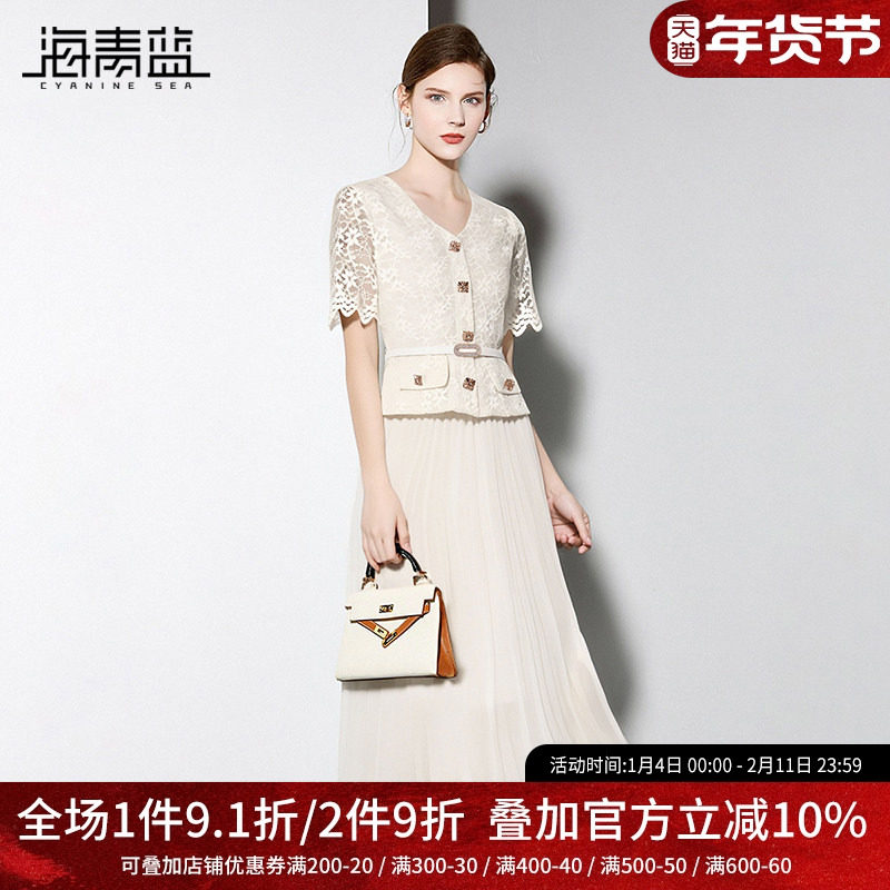 海青蓝 蕾丝短袖连衣裙女2025年新款夏季女装时尚气质高级百褶裙