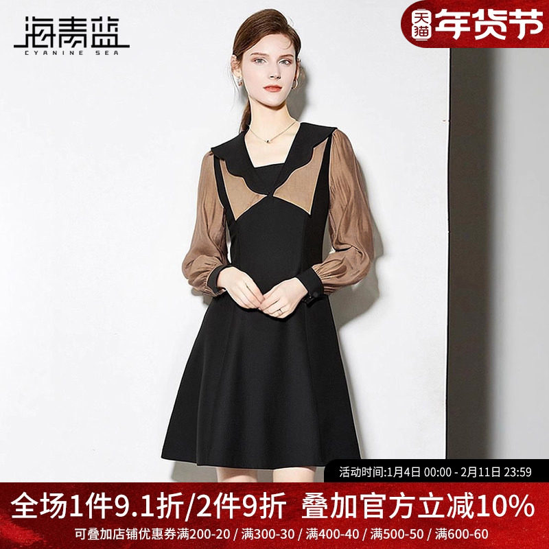 海青蓝 秋季连衣裙2025年新款时尚气质女装撞色中长款高级裙子