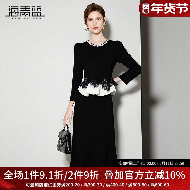 海青蓝 连衣裙秋女2025新款高级设计感小众绣花黑色漂亮女装裙子