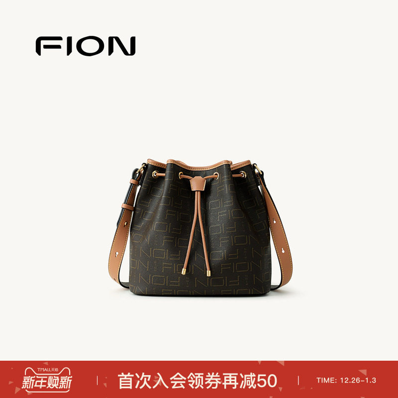 Fion/菲安妮老花水桶包女25新款抽绳轻奢感休闲通勤单肩斜挎包包