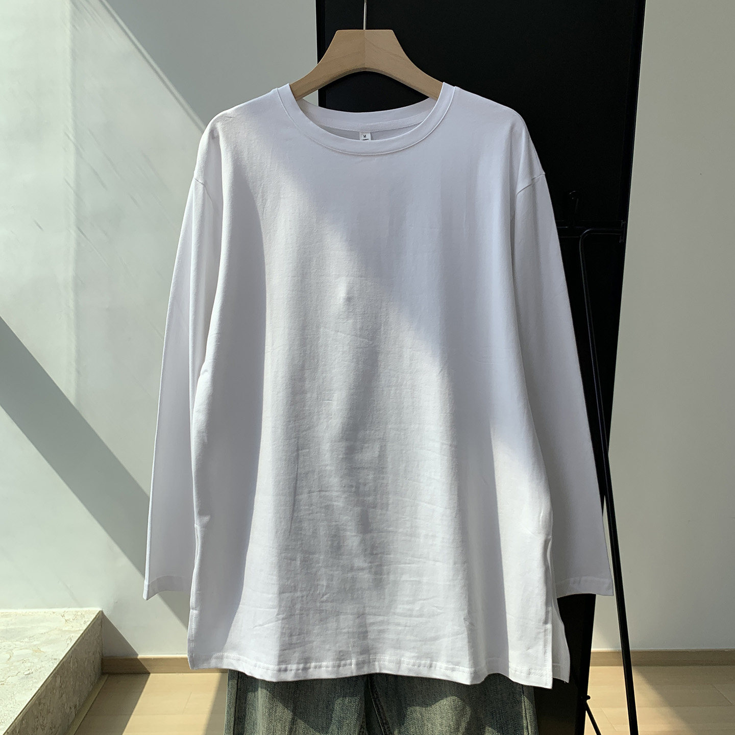 长袖中长款韩版原宿白色大码下摆开叉打底衫上衣宽松T恤女春纯棉