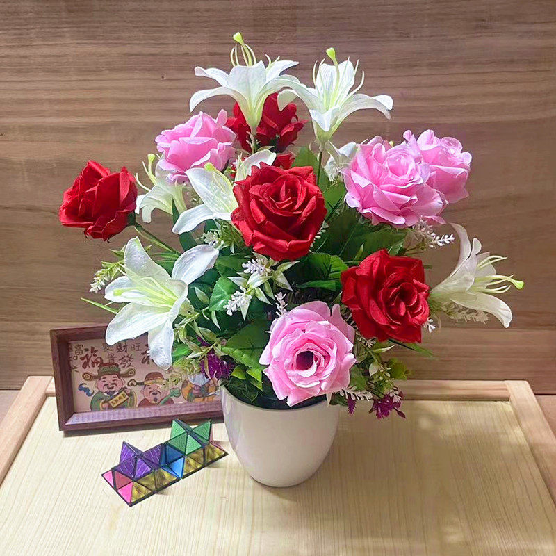 仿真花玫瑰花百合组合花绢花一束9朵假花客厅卧室餐桌茶几装饰花