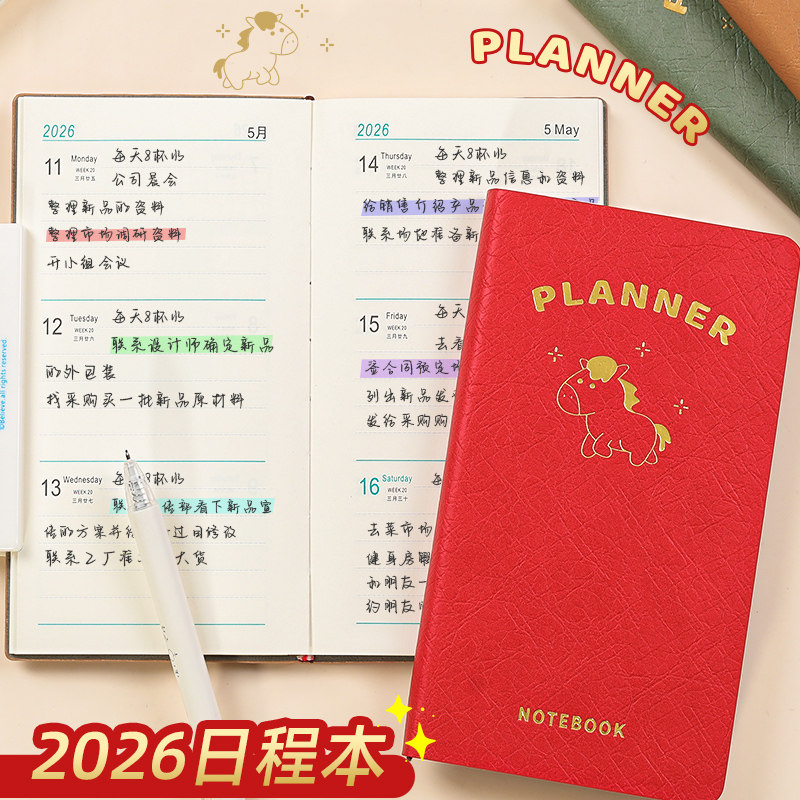 2026马年日程本随身便携小本子365天每日计划本一周两页日记本a6日历记事本可定制LOGO工作打卡皮面效率手册