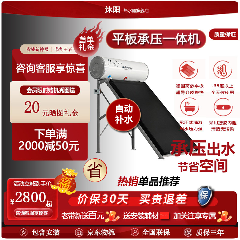 沐阳太阳能平板承压式热水器家用大容量式自动补水一体机光电两用
