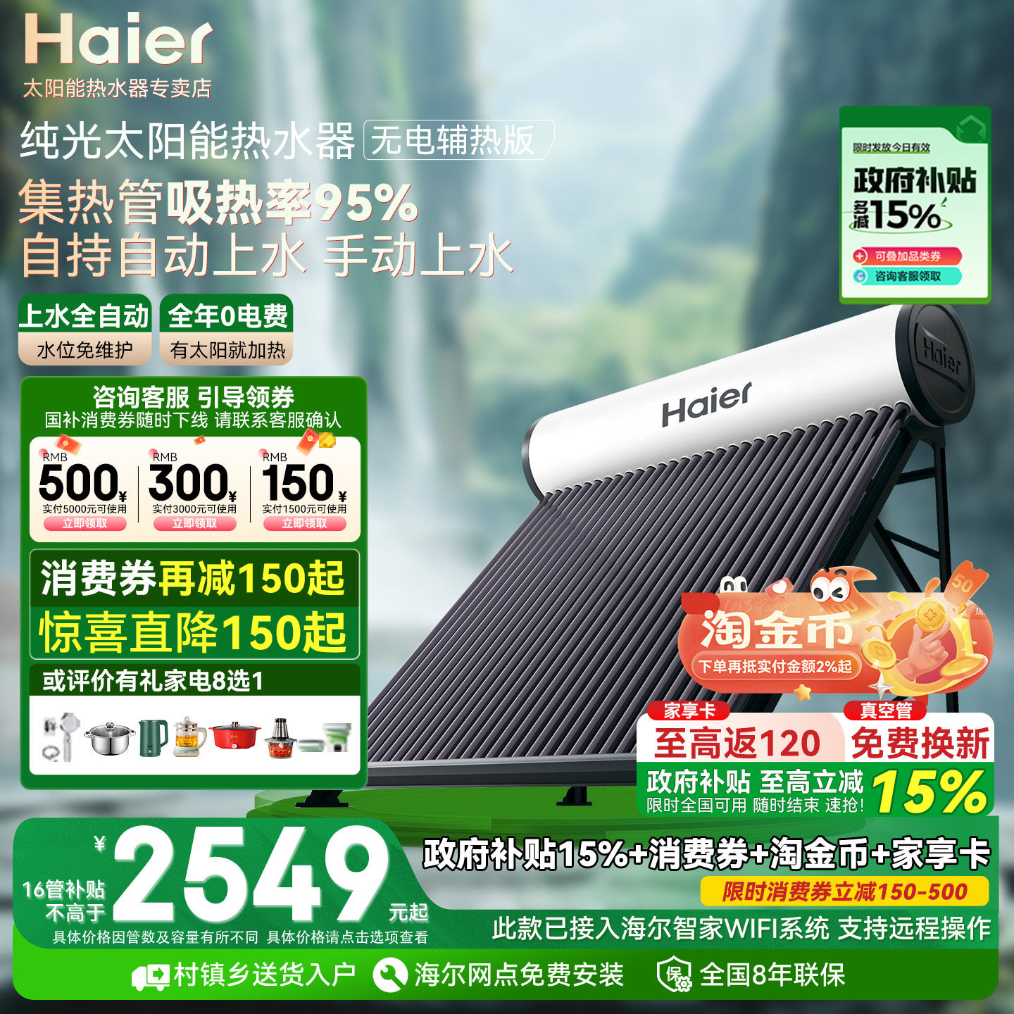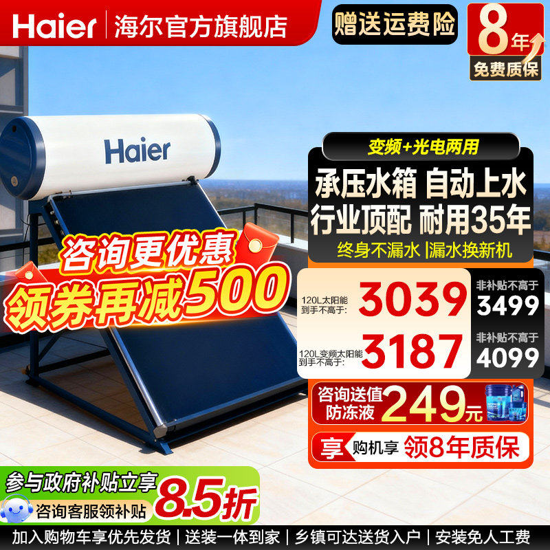 【政府补贴15% 】海尔太阳能热水器电加热家用一体式农村集热水器