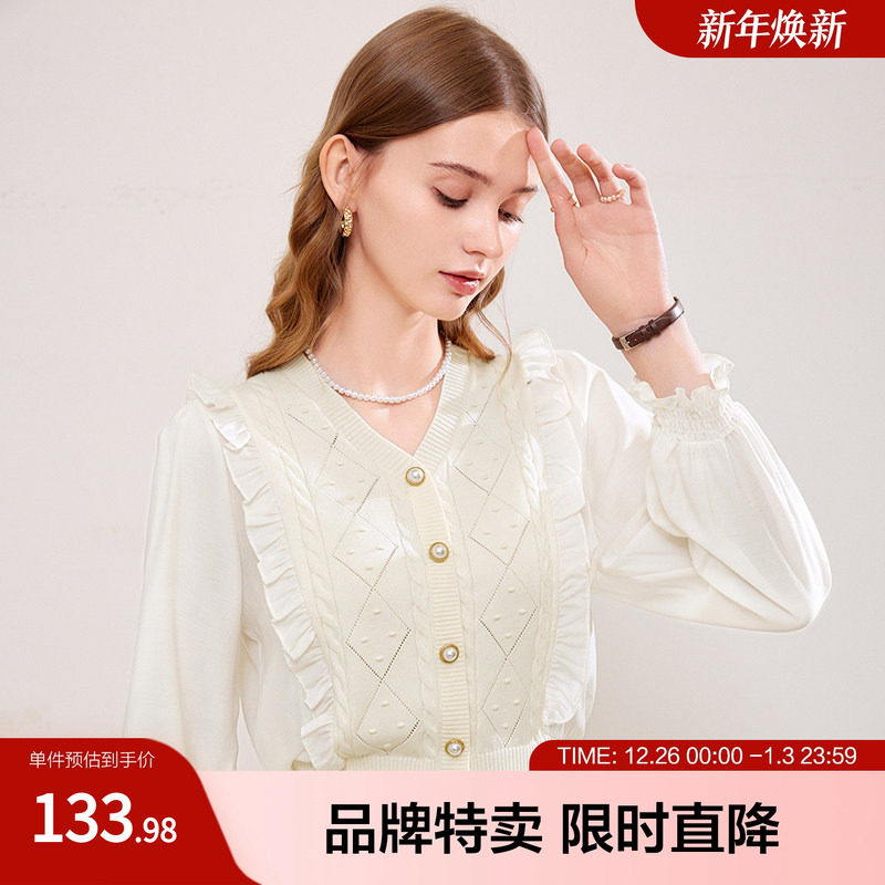betu百图气质V领针织衫春夏新款针织雪纺拼接长袖套头针织衫女