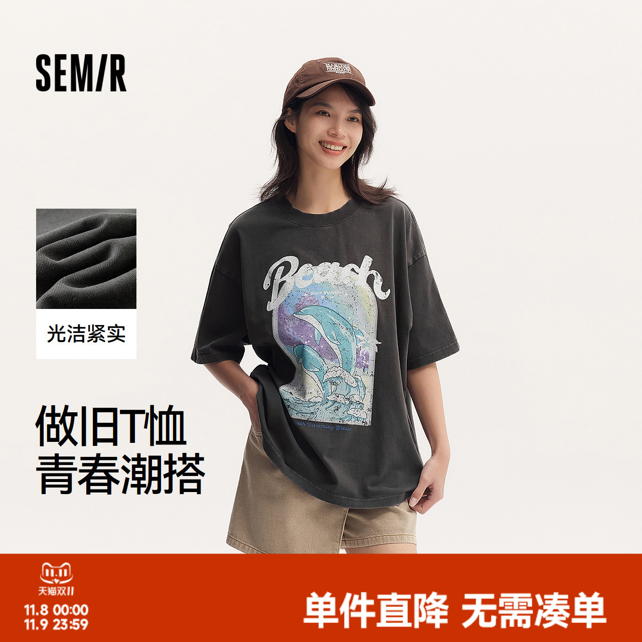 森马短袖T恤女中长款印花街头小众夏季oversize做旧衣服复古潮酷