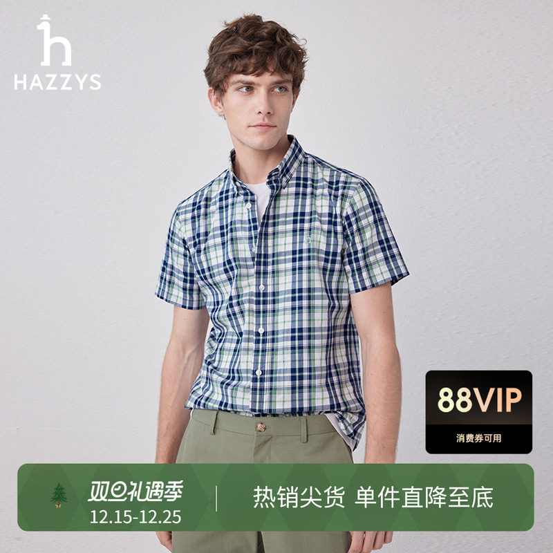 Hazzys哈吉斯夏季男士短袖衬衫休闲简约格子衫男上衣时尚舒适衬衣
