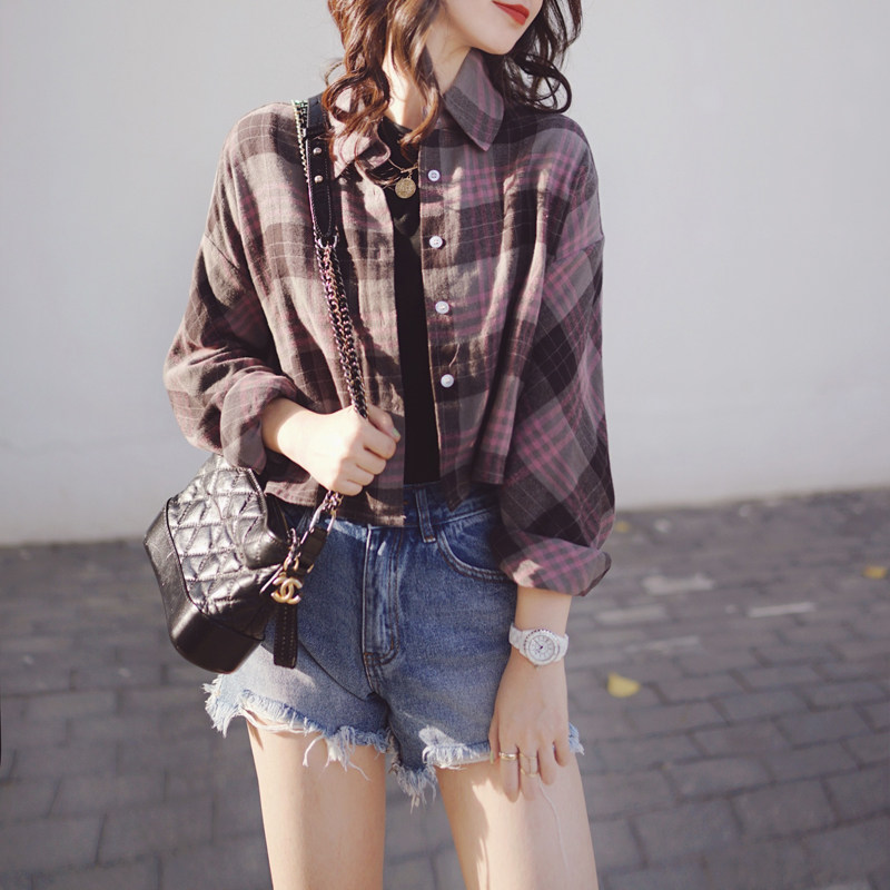 2024秋粉灰色格子衫小个子短款宽松外套磨毛法兰绒经典长袖衬衫