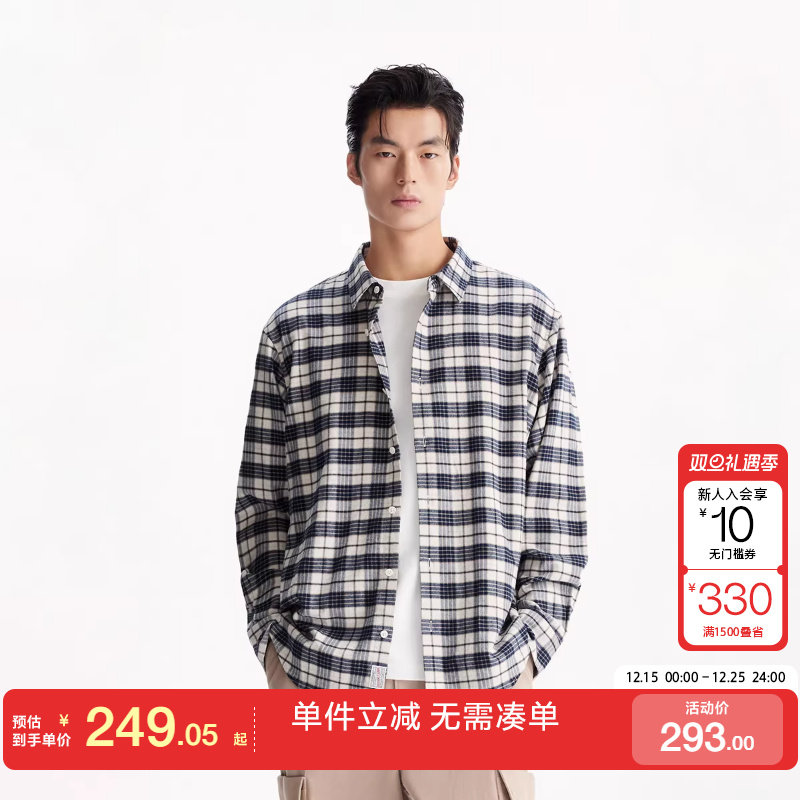 HM男装衬衫2025冬季新款宽松法兰绒格子衫长袖保暖衬衣1296170