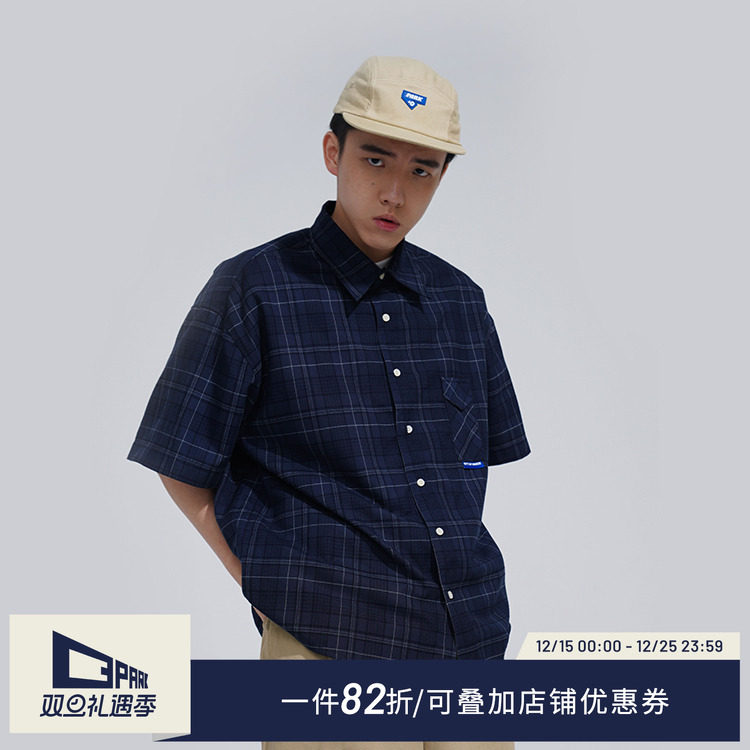 O3PARK宽松休闲日系落肩格子衫cityboy重磅半袖格纹短袖衬衫
