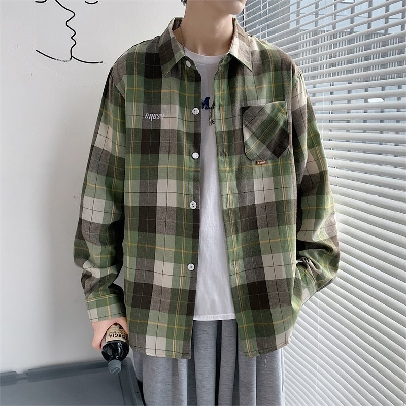 春秋绿色街头格子衬衫男复古宽松衬衣潮牌嘻哈长袖韩版男生格子衫