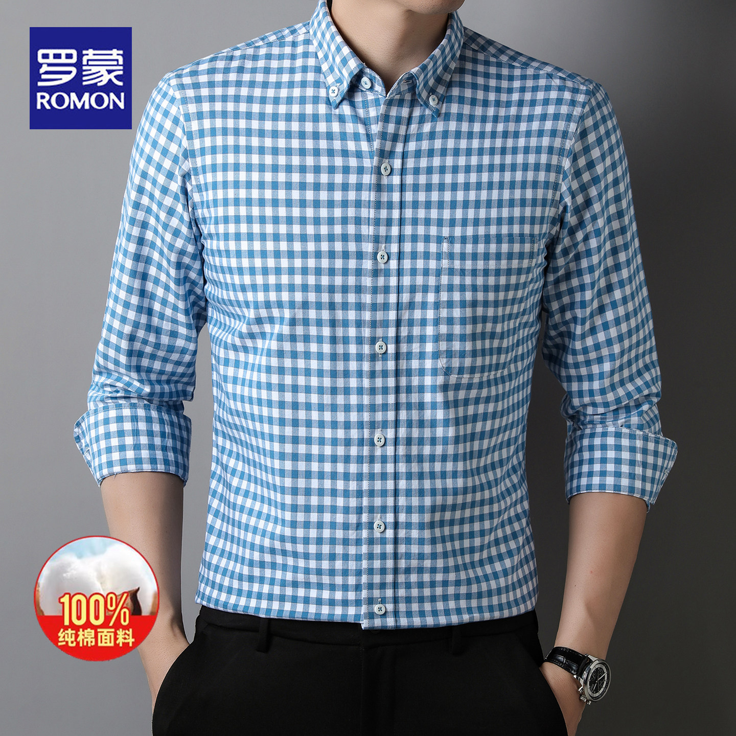 罗蒙春秋新款长袖格子衫男士商务休闲亲肤舒适全棉撞色衬衣打底衫