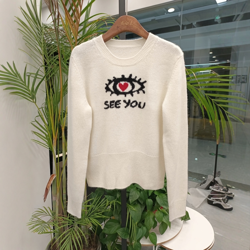 文艺范山羊绒针织上衣女字母刺绣简约风宽松百搭白色圆领套头毛衣