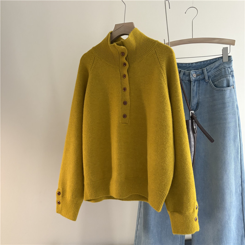 韩国订单秋冬新款宽松慵懒风半高领插肩袖加厚叠穿套头排扣毛衣女