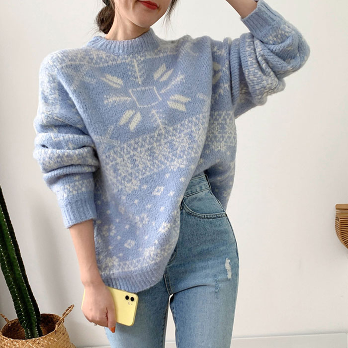 现货韩国东大门女装2025春秋韩范休闲宽松雪花图案套头针织毛衣潮