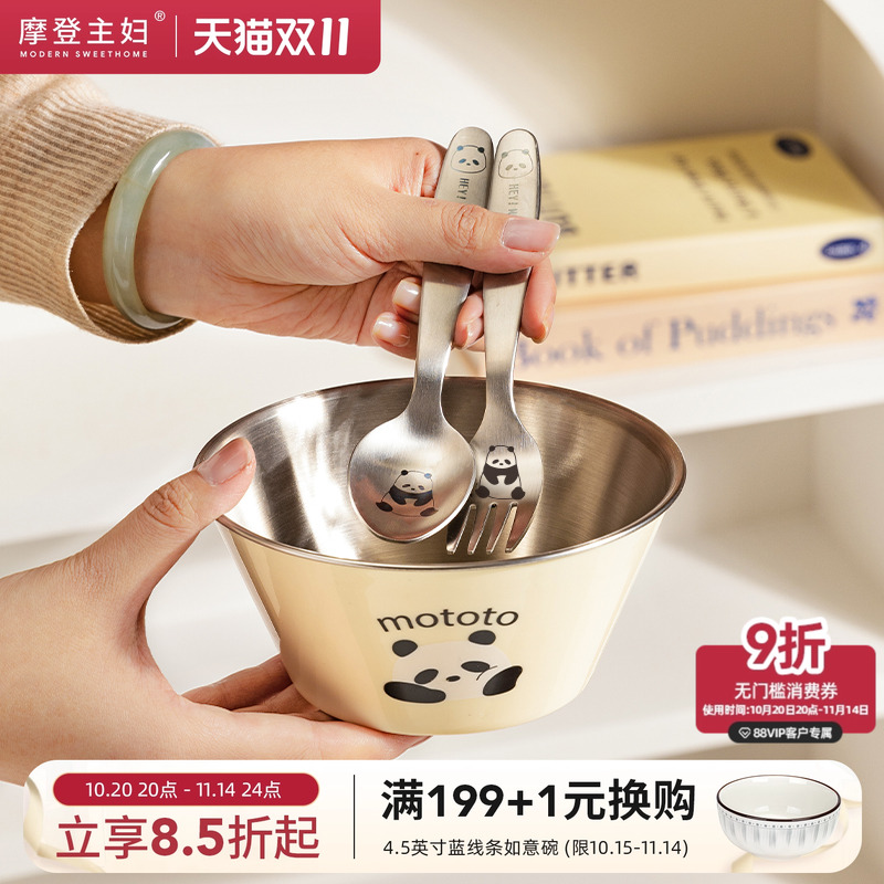 摩登主妇mototo熊猫316L不锈钢儿童饭碗6岁以上食品级宝宝辅食碗