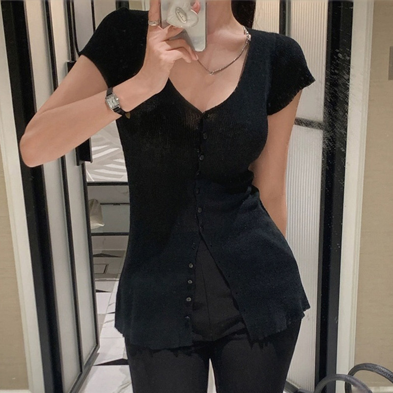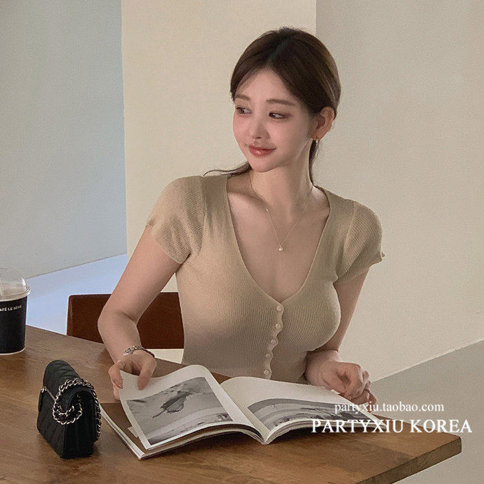 韩国东大门韩系时尚v领修身性感单排扣纯色短袖女士针织衫上衣潮