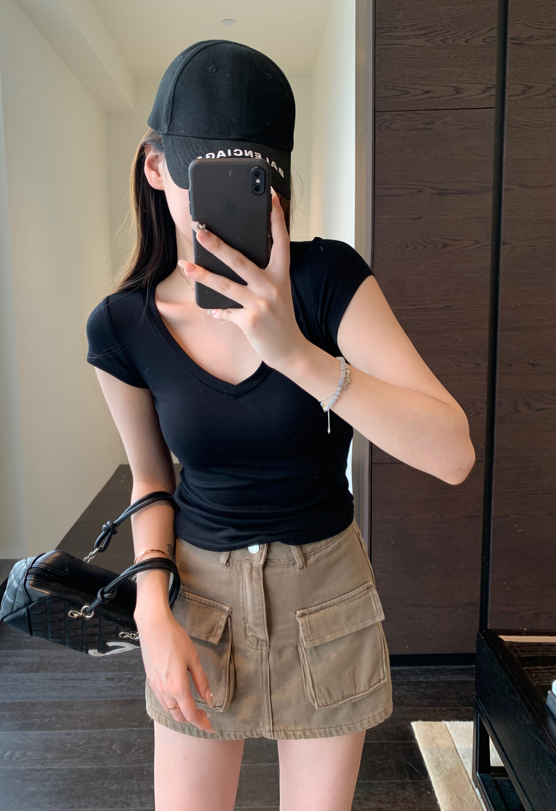 AMR UU◆辣妹T恤 巨洋气小短款修身显瘦V领纯色短袖女夏季新款