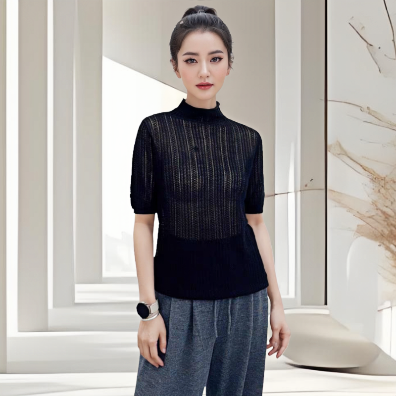 一线成衣100%纯羊毛衫女半高领五分袖纯色短袖女针织打底羊毛上衣