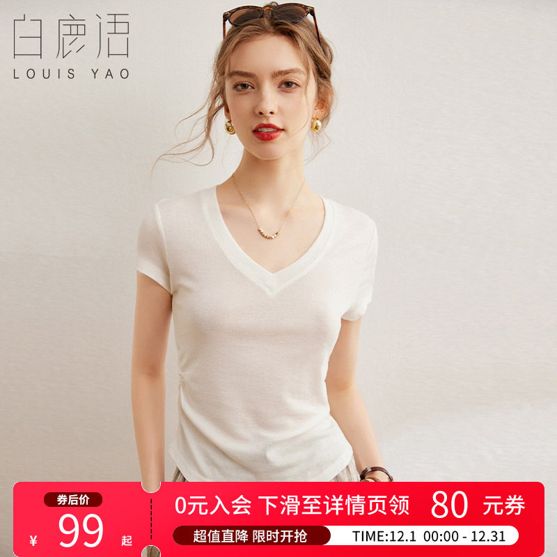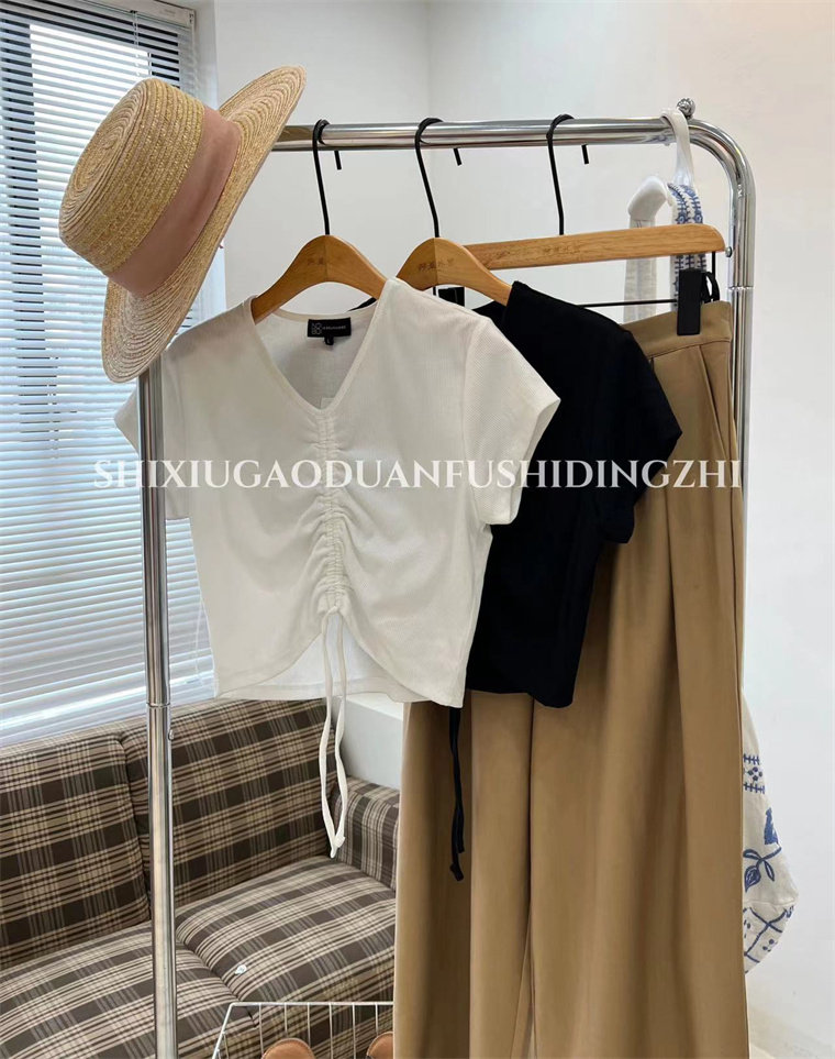 「阿董外贸」2023夏款V领抽绳显瘦修身小个子基础T恤纯色短袖女