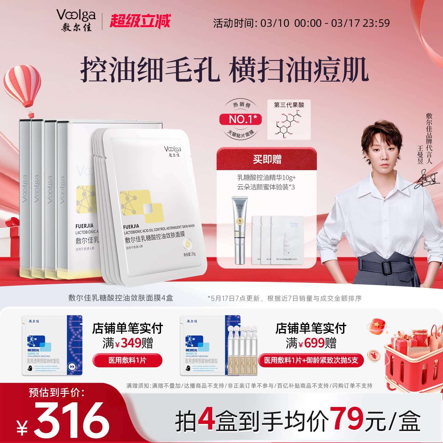 【淘宝秒杀】敷尔佳乳糖酸控油敛肤面膜2片收缩毛孔控油精华次抛