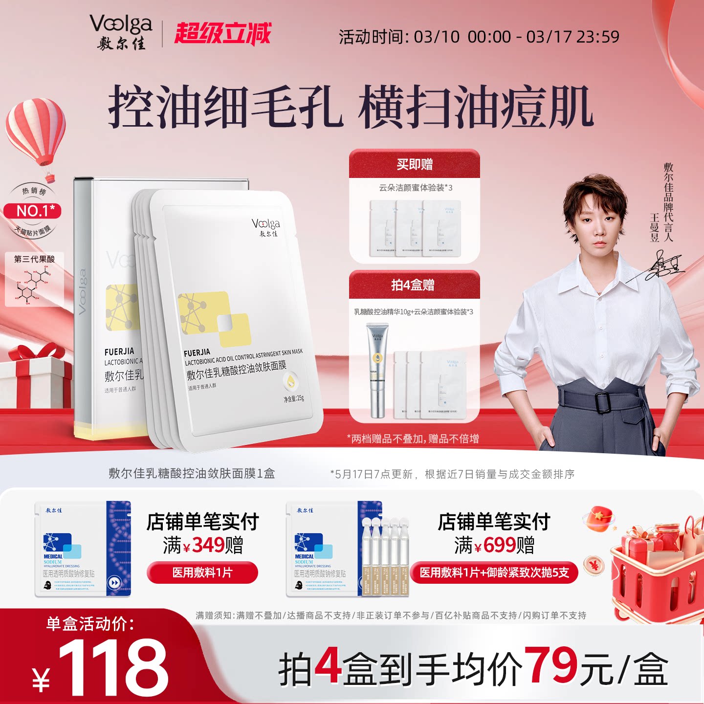 【U先试用】敷尔佳乳糖酸控油面膜2片紧致收缩毛孔祛痘保湿油痘肌