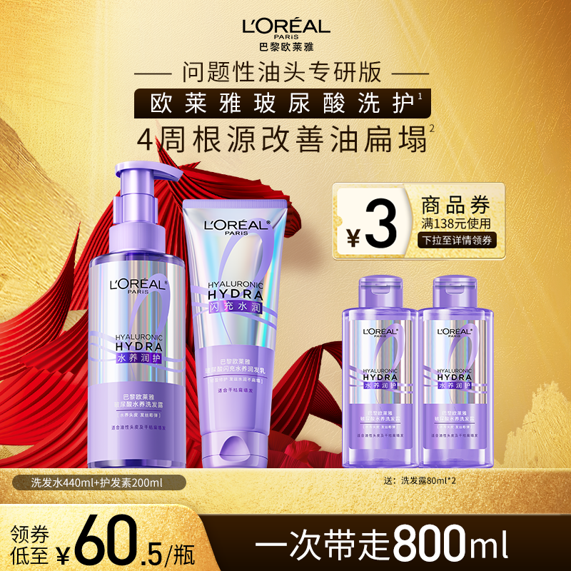 巴黎欧莱雅洗发水护发素透明质酸控油无硅油洗护套装去屑持久留香