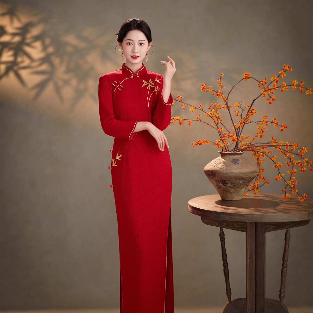 大码敬酒服新娘2025新款冬季结婚答谢宴会红色丝绒长袖订婚礼裙女