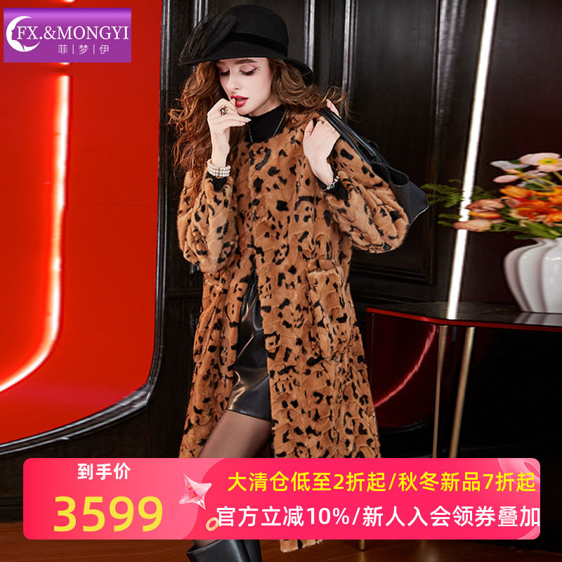 菲梦伊豹纹印花水貂毛整貂皮草外套女冬季阔太太加厚皮毛一体大衣