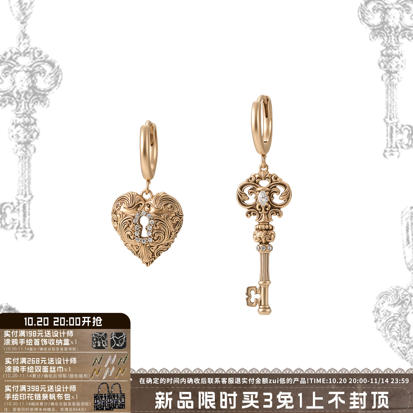 【10.20 20:00开售】SUMIYAKI 复古爱锁芯系列不对称钥匙爱心耳环