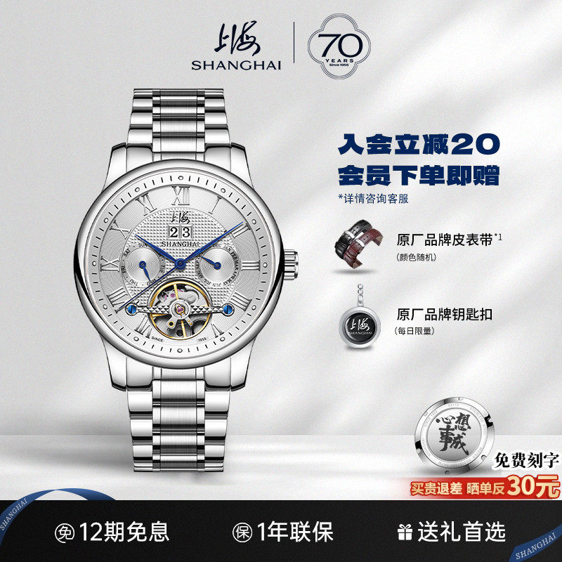 新款【70周年】上海手表3023自动机械表男款双历防水透底商务简约