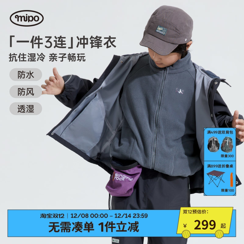 mipo秋季儿童冲锋外套户外男女童登山服防风防水软壳衣亲子内胆