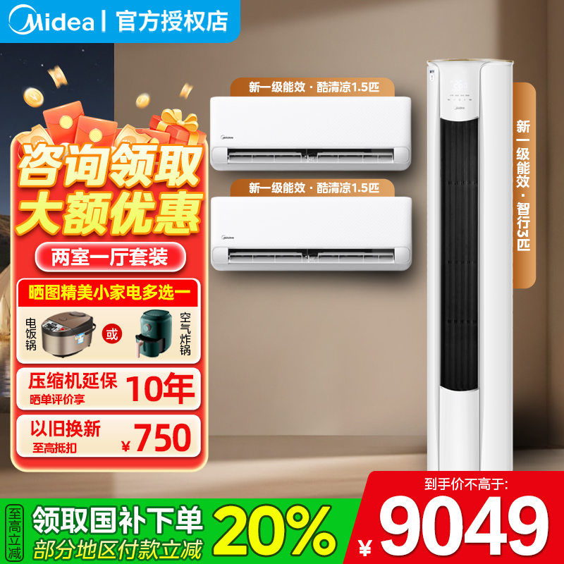 【补贴20%】美的空调挂机酷清凉套装三室一厅一级能效3匹柜机官方